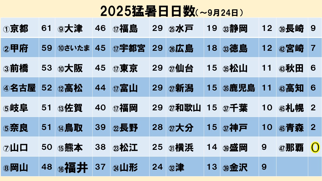 ちなみに、沖縄県には那覇がある本島地方のほか、宮古島や石垣島などの島々を合わせて25の観測地点があるのですが、今年は猛暑日になった地点は1つもありませんでした。