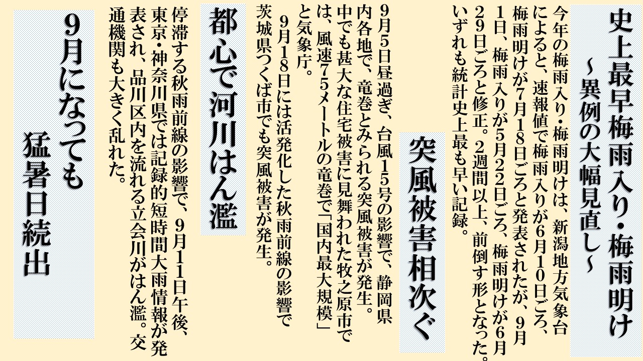そして、9月は秋雨前線が度々猛威を振るいました。静岡や茨城、そのほか、高知県などで突風被害、また線状降水帯が発生したり、記録的短時間大雨情報の発表が相次ぎ、東京都心でも川のはん濫が発生したりしました。