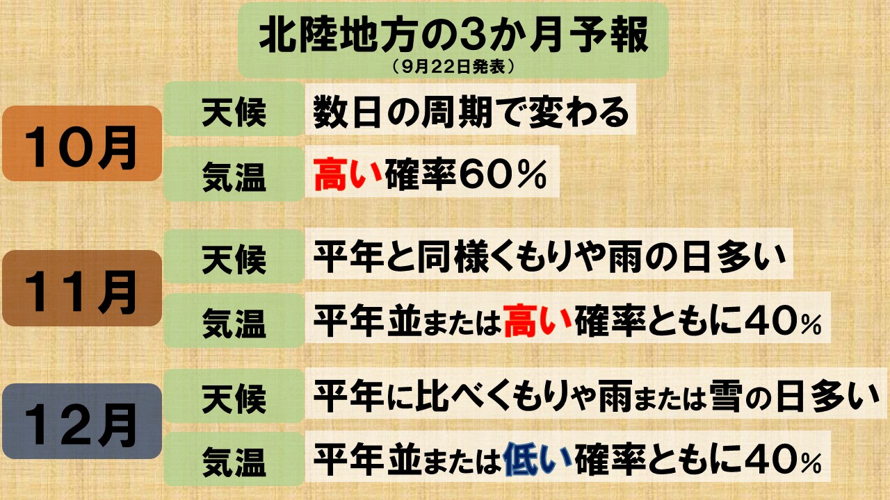 9月22日に発表された3か月予報をみると、10月は、平年より高い確率が60%。