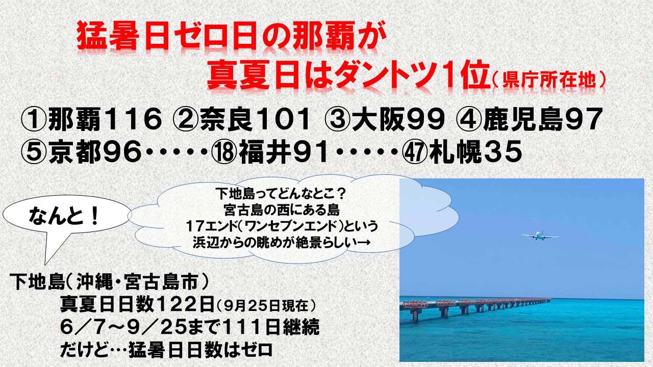 ところが、30℃以上の真夏日の数は那覇が、47地点中ダントツの1位です。