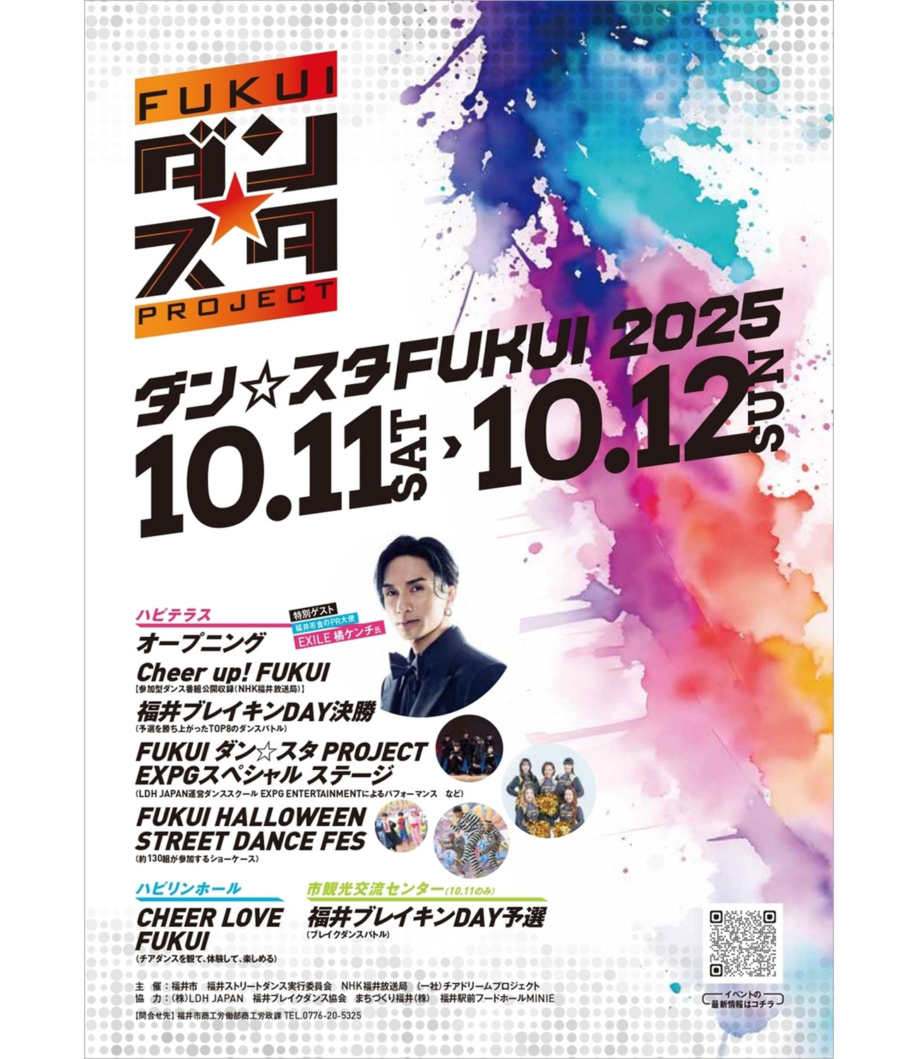 さらには、全国のB-Boy、B-Girlによる白熱のブレイキンバトルや、EXPG ENTERTAINMENT選抜メンバーのパフォーマンス、NHK福井放送局の視聴者参加型ダンスバトル番組「Cheer up!FUKUI」の公開収録(NHK福井放送局にて10月24日(金)放送予定)も決定しており、これまでにないスケールで福井の街をダンス一色に染めていきます。