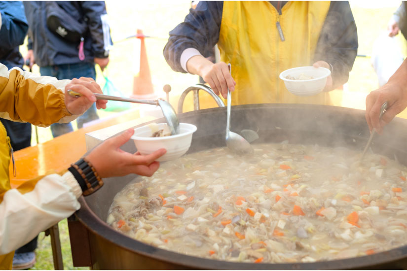 福井県内でも有数の紅葉スポット「大野市和泉地区」で、美しく色づいた紅葉を愛でながら秋の味覚(九頭竜まいたけ、さといもなど)や手打ちそばなどを堪能しよう。毎年人気の大鍋もぜひ味わって。