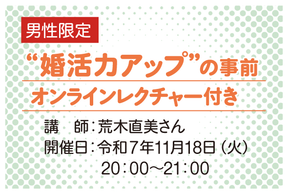 また、男性参加者は荒木先生による事前オンラインレクチャーに参加することができます。24日のイベント前に直接アドバイスをもらえる機会! ぜひ参加して本番に向けての婚活力をアップしましょう!