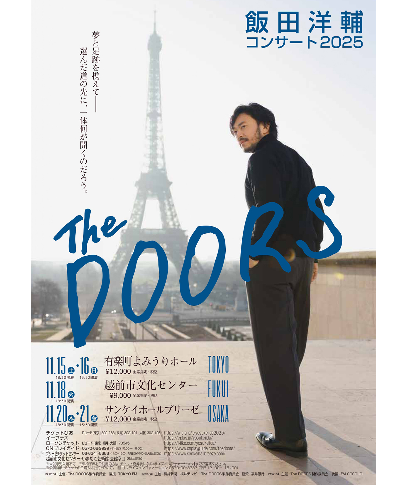 越前市出身のミュージカル俳優・飯田洋輔さんが、11月18日(火)に初の凱旋コンサート『The DOORS』を開催します。2023年末に、20年にわたり在籍した劇団四季を退団した飯田さん。『キャッツ』『オペラ座の怪人』『美女と野獣』など、数々の名作でプリンシパルを務め、その存在感と歌声で多くの観客を魅了してきました。退団後も、帝国劇場クロージング公演『レ・ミゼラブル』でのジャン・バルジャン役や、『ジャージー・ボーイズ』のニック・マッシ役など、話題作への出演が続いています。