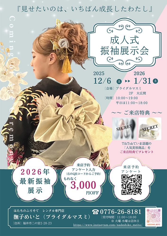 福井の衣裳店『ブライダルマスミ』が手掛ける、はたちの振袖レンタル専門店「撫子めいと」で、来年の成人式に向けた振袖展示会を開催! 衣裳店が運営するお店だから、はじめての振袖選びも安心。信頼のサービスで、 “晴れの日”を素敵にサポートしてくれます。