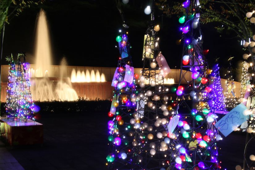 昼間は多くの家族連れでにぎわう鯖江市「西山公園」に、美しくライトアップされたクリスマスツリーが登場! 光り輝く中央公園の噴水とともに、幻想的な世界をつくりあげています【 2025/11/1(土) ~2026/1/15(木) の期間開催】。