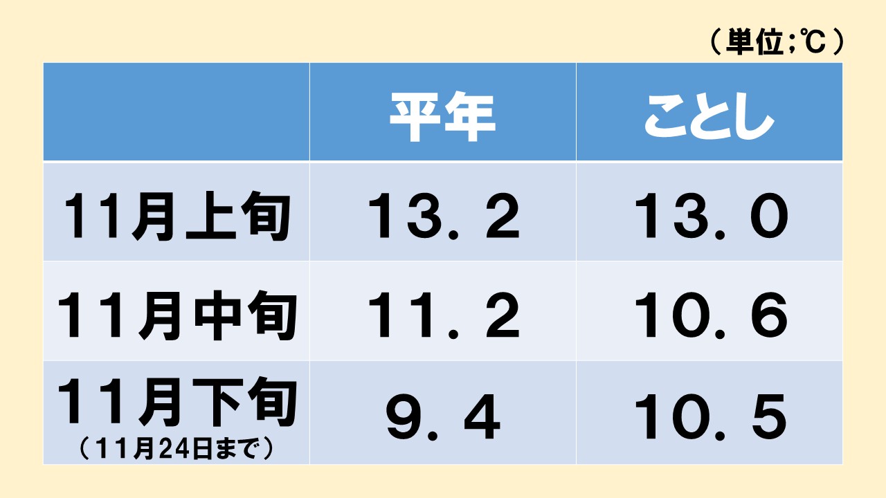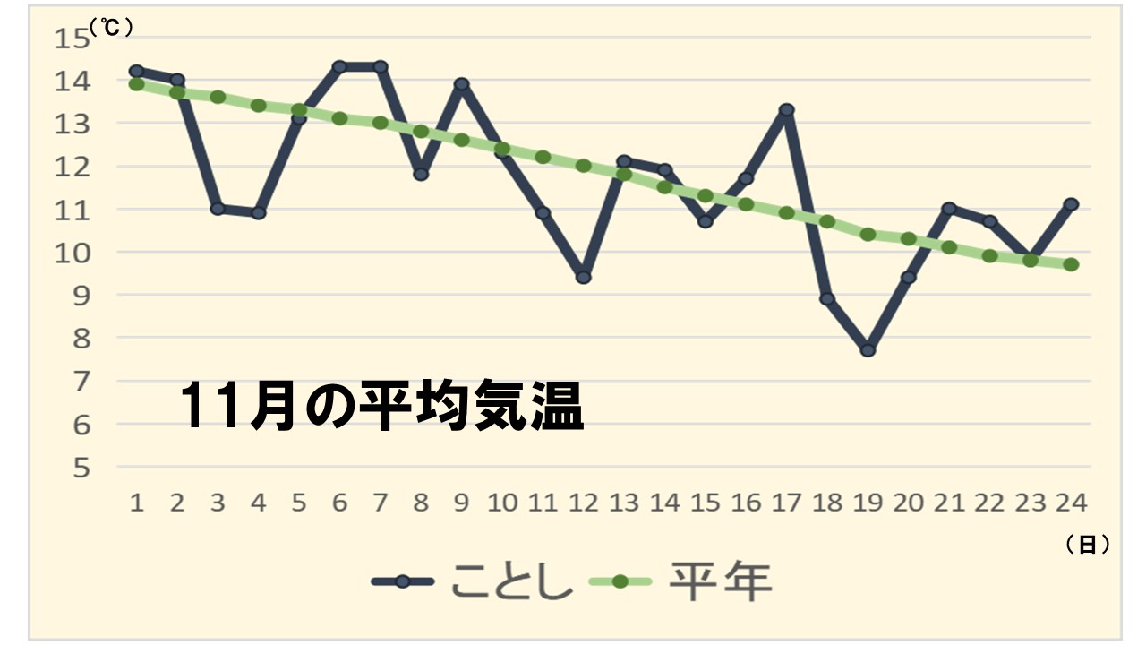 10月までの記録的な暖かさから、11月は、気温が平年を上回る日もあったものの、冬を先取りしたかのような寒さの日もあって、あったかいんだか、寒いんだか、わからないような1か月でした。