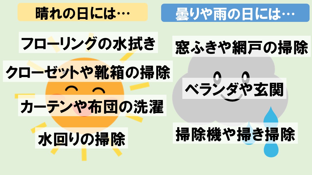 そこで、さらに天気を味方につけてもらうべく、天気ごとにおすすめの大掃除メニューをご参考までにまとめてみました。