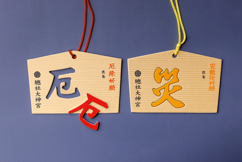 厄除け祈願、八方方位除け祈願(お初穂7000円以上)を受けた際に授与される「厄落とし・災落とし絵馬」。「厄」や「災」などの型抜き文字を自ら押し出して「落とす」ことで厄除けができるユニークな授与品だ。祈祷料、5000円・7000円・10000円で授与品は異なる。