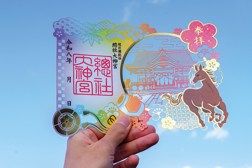 2024年に「光る君へ」の放送を記念し、紫式部をイメージした御朱印を頒布。藤の花や菊の花の美しい切り絵をあしらった意匠が話題を呼んだ。2026年元旦からは干支の馬や總社⼤神宮の拝殿、神紋をモチーフにした新たな切り絵御朱印を頒布開始。「干支 御朱印」1200円