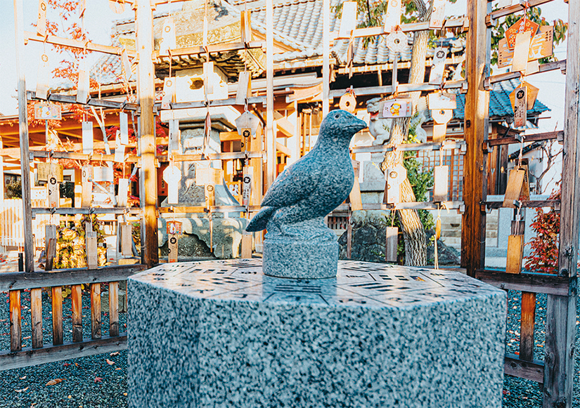 絵馬掛け所の中央には、八幡大神の神使である鳩が鎮座。石づくりの鳩は回転させることができるようになっていて、鳩を自分の吉方位に向けて絵馬を掛けると良いとされている。鳩に願いを託して開運につなげよう。