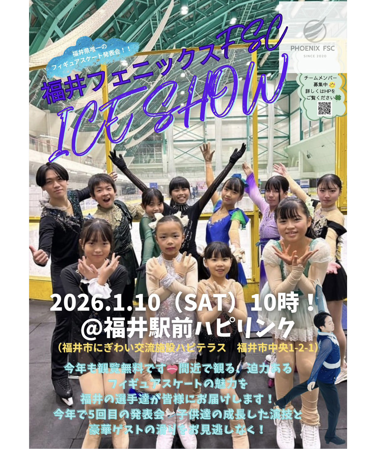 毎年冬になると、ハピテラスに期間限定で登場する屋外スケートリンク「ハピリンク」。福井駅前で家族や友達と手軽にスケートが楽しめる場所として賑わう大人気スポットで、今年も「福井フェニックスフィギュアスケートクラブ」によるアイスショーが1月10日(土)に開催されます。