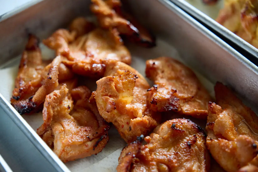 『前田かしわ店』で40年以上愛され続けてきた「親鶏ロースト」。初代が「うま醤油」味で作りはじめ、それを二代目が受け継ぎ今回三代目が「ガーリックペッパー」「うま辛ラー油」「カレー」の新味を商品化しました。親鶏は採卵用として飼育され、産卵を終えた雌鶏のこと。柔らかくジューシーな若鶏に対して、親鶏は噛むほどに旨みとコクが広がり、通が好む味わいと言われています。永平寺町の地元の醤油や、昔ながらの和釜を用いた伝統的な製法にこだわる『田辺酒造』の酒粕など、永平寺町が誇る調味料が脇を固め、ムネ肉の旨みをさらに引き出しています。