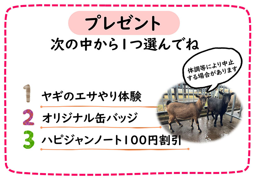 さらに、バスを利用した人だけのお楽しみも。降車時にもらえる「プレゼント引換券」を受付で渡すと、ちょっとしたプレゼントがもらえます。バスを降りる際に受け取り、動物園の受付で交換してくださいね。