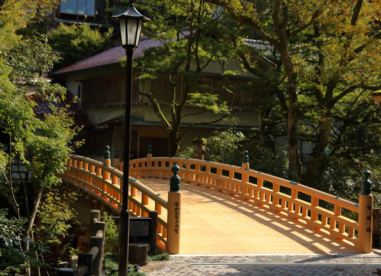 『こおろぎ橋』は、橋長20.8m幅員4mの総ヒノキの木造橋であり、昭和16年に現在の橋の形となってから今回で3回目の架け替えとなります。4代目となっても素材やデザインを踏襲し、これまで同様の風情ある橋となっています。