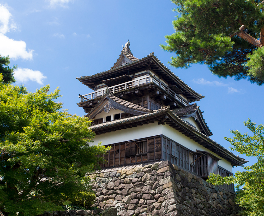 現存する天守閣の中でも古い建築様式を持つ平山城。戦国時代に一向一揆の備えとして、織田信長の命により柴田勝家が甥の勝豊に築城させました。あえてすき間を大きくした“野づら積み”という方式で積まれた石垣にも注目を。排水がよく大雨に崩れる心配がないという工夫がされています。また、日本庭園式公園も隣接し、桜や紅葉の季節には幻想的で風情溢れる雰囲気に包まれます。