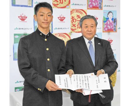 第九十八回全国高校サッカー選手権大会(三十日~来年一月十三日、首都圏)に出場する県代表の丸岡の選手、監督らが六日、福井市の県農業会館を訪れ、JA県五連からいちほまれ三百キロを贈られた。