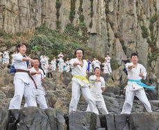 空手の闘己會(とうきかい)吉塚道場(本部・福井市)の寒稽古が五日、坂井市の東尋坊であった。本部と県内十五支部から、五歳から七十歳代までの計二百六十人が参加。日本海からの寒風や波しぶきにも負けない気合で、勢いよく突きや蹴りを繰り出した。