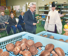 県産の高級ジャンボシイタケ「香福茸(こうふくだけ)」の初出荷を前に、神事の「幸福祈願」と目ぞろえ会が九日、越前市矢船町の武生青果であった。神事には生産者らが参列し、食べた人に「幸福だけ」が訪れることを願った。目ぞろえ会では、傘の大きさや厚みなどを確認し、最高級の「金ラベル」などを選別した。(中場賢一)