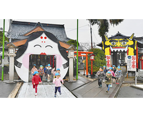 節分(2月3日)を控え、福井市和田3の和田八幡宮に、鬼とお多福をかたどった巨大な面が設置された。29日には近くの和田こども園の年長児14人が訪れ、小雨の中、面をくぐり抜けたりしてはしゃいでいた。