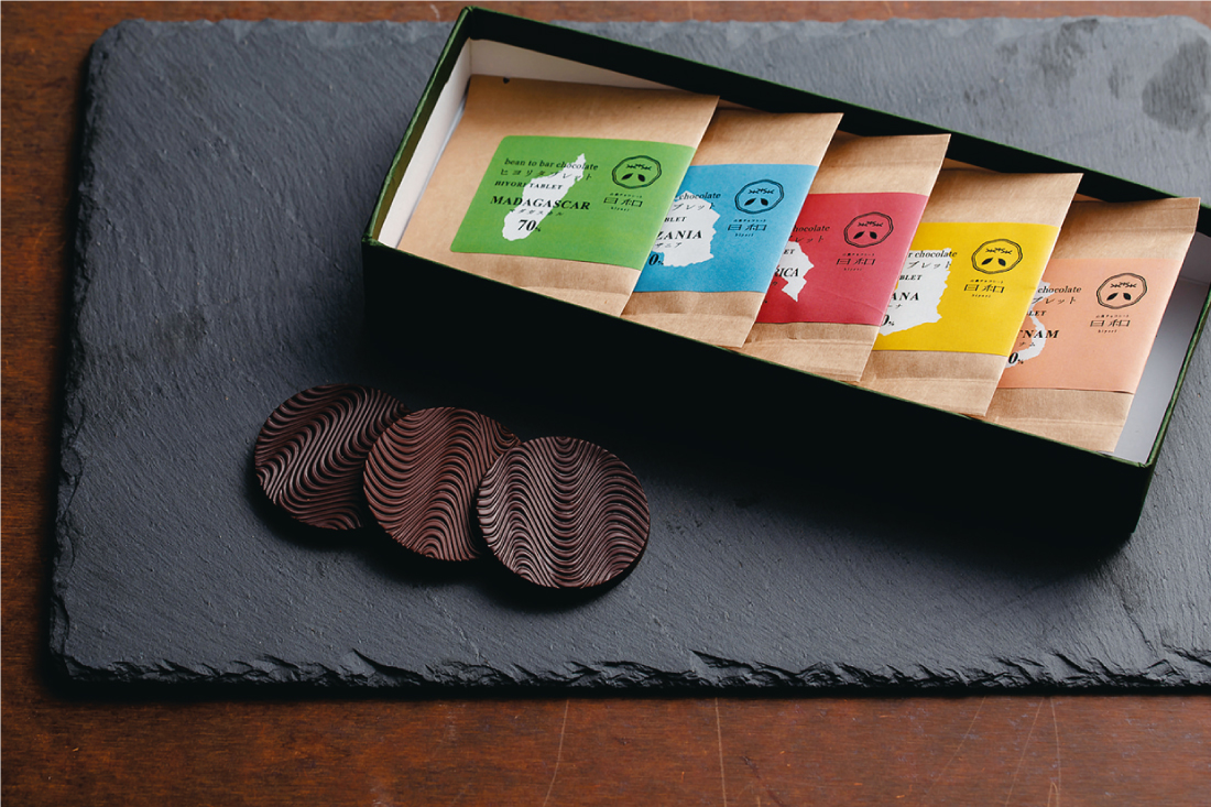 ガーナ、タンザニアなど産地の異なる5種のチョコタブレットをセットに。原材料はカカオと砂糖のみ。味や香りの違いをダイレクトに楽しめる。