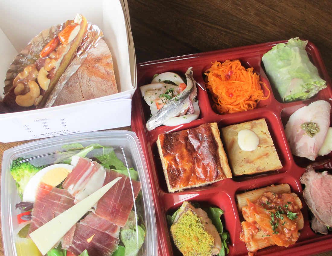 スペインを中心としたレストラン兼花屋が手掛けるメニュー。弁当には9つの洋風惣菜と自家製じゃがいもパン、サラダ、ガトーショコラがついていて、見た目もボリュームも大満足の内容。