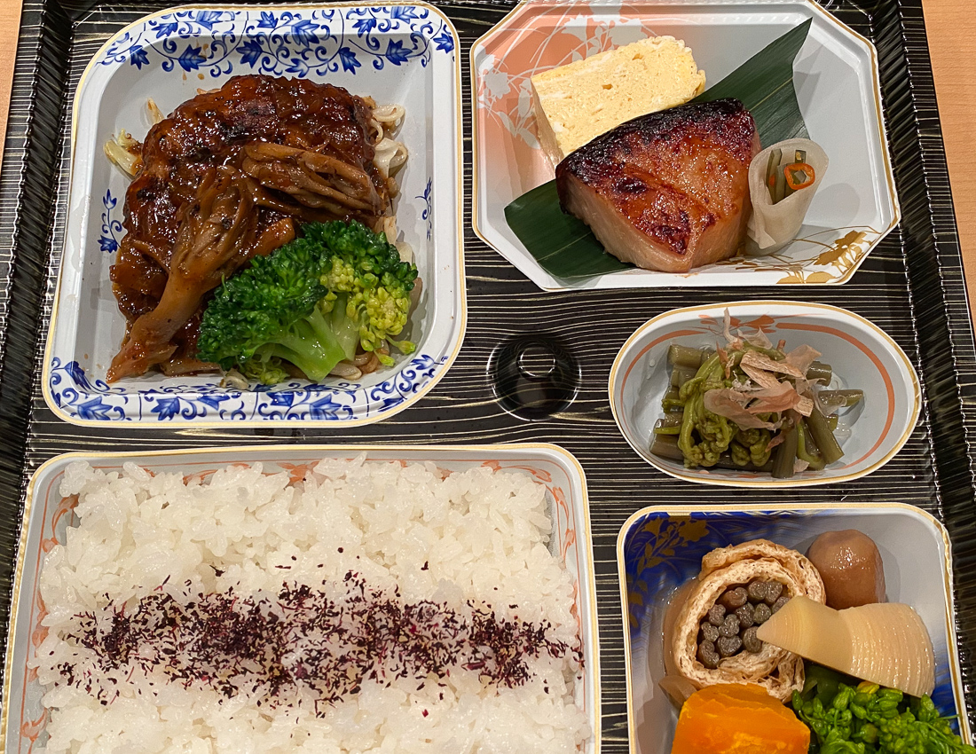 肉、魚、野菜の入った弁当は、甚兵衛ならではの味わい。希望に沿うことも可能なので電話で相談を。