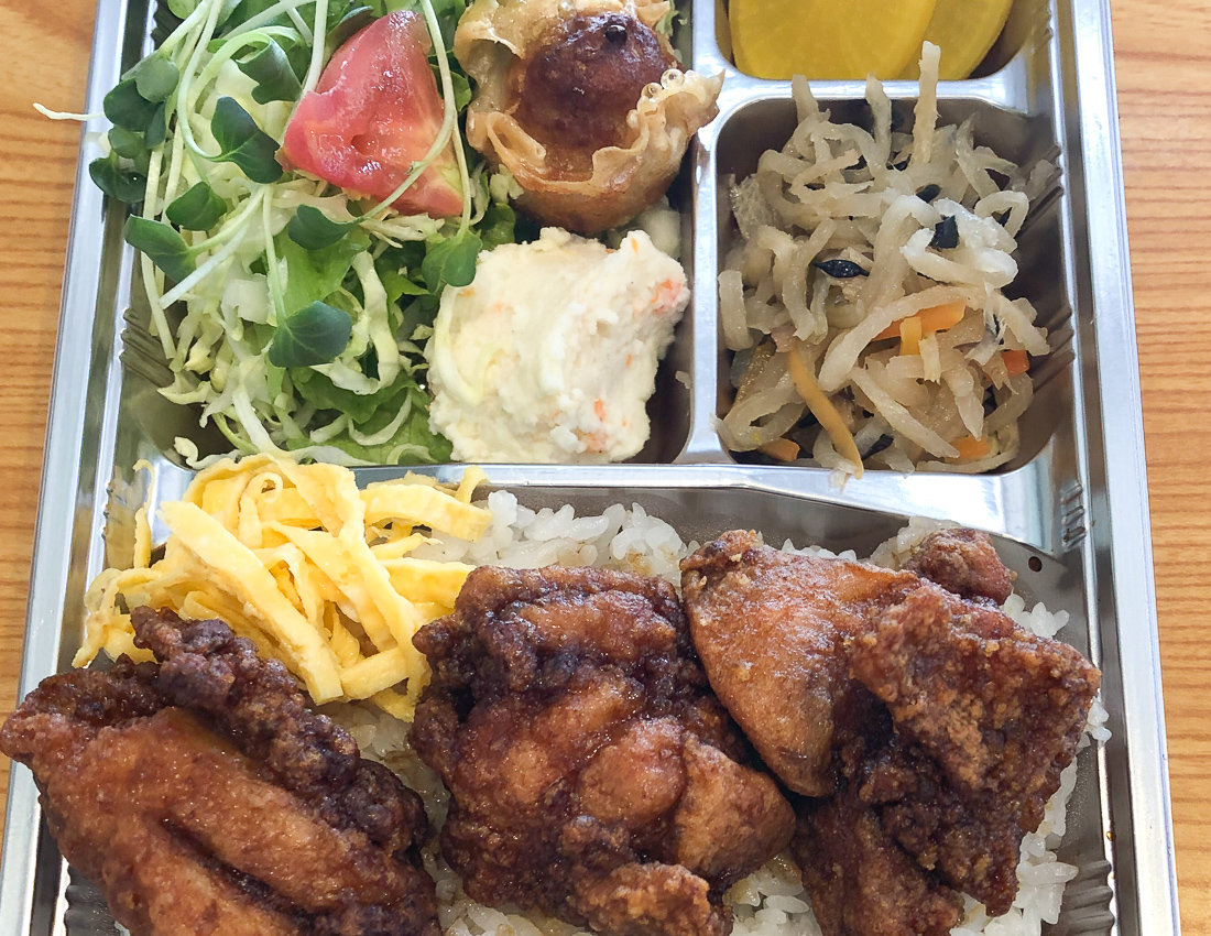 やっこ自慢のカラ揚丼に野菜サラダ、揚シューマイ、大根なま酢をプラスして弁当に仕上げた。