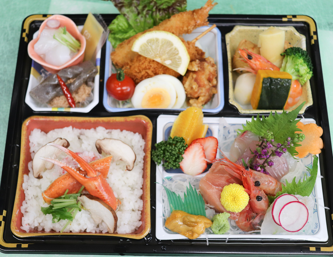 日本海の源泉された海の幸、また石丸自慢のカニ釜めしを家庭でも味わおう。「越前波乃華弁当」を注文するとコーヒーのテイクアウトをサービス。
