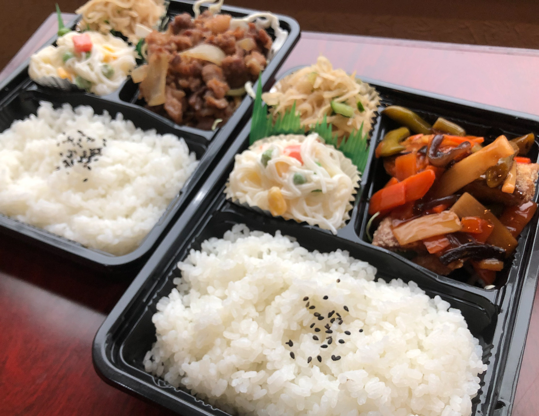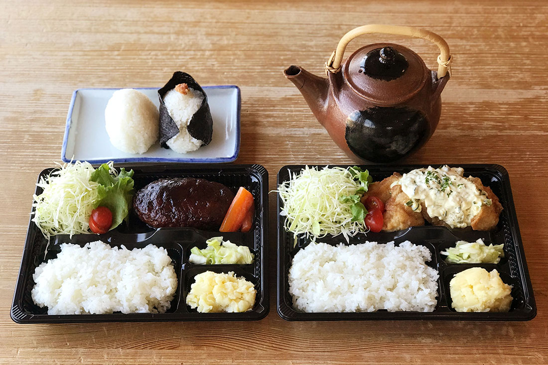 「チキン南蛮弁当」「ハンバーグ弁当」「おにぎり弁当」など、人気メニューを中心に限定数にてテイクアウト販売を開始。地元農家で収穫したコシヒカリをガス窯で炊き込んだご飯を提供。お弁当はすべて出来立て。