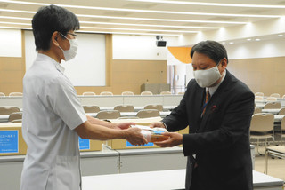 橋爪院長に弁当を手渡す反保総支配人(右)=30日、福井市の県立病院で