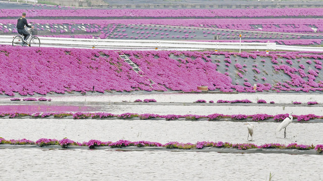 大野市乾側地区を中心に広がる田んぼののり面に植えられたシバザクラが見頃を迎えている。新型コロナウイルス感染症予防で外出を自粛する県民が多いため訪れる人は影をひそめ、サギなどの鳥たちが田んぼでエサをついばみながら、特等席で絶景を楽しんでいる。
