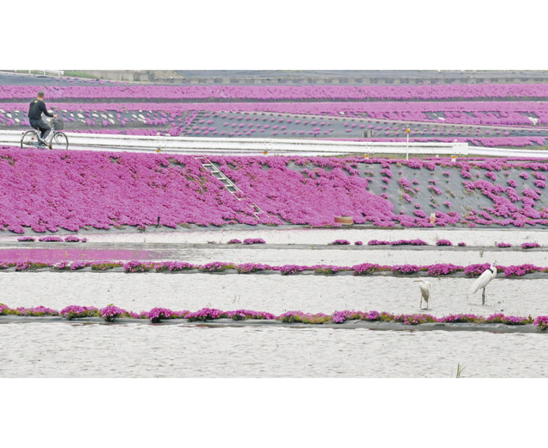 大野市乾側地区を中心に広がる田んぼののり面に植えられたシバザクラが見頃を迎えている。新型コロナウイルス感染症予防で外出を自粛する県民が多いため訪れる人は影をひそめ、サギなどの鳥たちが田んぼでエサをついばみながら、特等席で絶景を楽しんでいる。