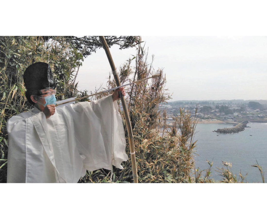 坂井市三国町安島の大湊神社境内で三日、恒例の椿(つばき)祭りが始まり、海上の安全や無病息災を祈る神射式「二タ手之矢(ふたてのや)の神事」が営まれた。新型コロナウイルス感染症の早期終息の願いも込め、松村典尚(みちなお)宮司(48)が海に向かって鏑矢(かぶらや)を放った。