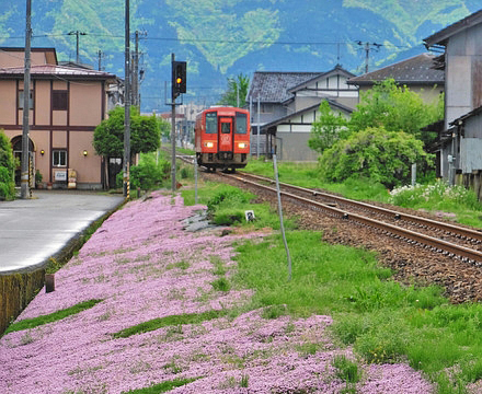 大野市下庄地区のJR越美北線沿いで、ハーブの一種「タイム」の花が見頃を迎えている。十日もかわいらしい小さな薄紫色の花々でできたじゅうたんのそばを、越美北線の赤い車両がのどかに走った。