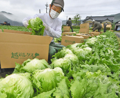 越前レタス 収穫本格化 越前町農家 「鮮度良く、癖少ない」 tounai 6年前 黒田さん(手前)らによって次々と収穫されるみずみずしい越前レタス=越前町上野で(山田陽撮影) みずみずしい春作レタスの収穫が、県内で本格化している。十一日は越前町内の生産農家が早朝から畑で作業に当たり、出来を確かめながら箱詰めしていた。 (日刊県民福井)続きはこちらから 日々URALAからのお知らせをLINEで受け取れます!