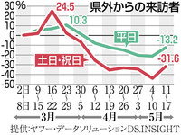 県の1週間まとめ大型連休後の一週間(十一~十七日)に県外から県内を訪れた人が、前週に比べ平日、土日ともに増加したことが、県のまとめで分かった。新型コロナウイルス特別措置法に基づく国の緊急事態宣言が、十四日に福井を含む三十九県で一斉に解除された影響とみられる。