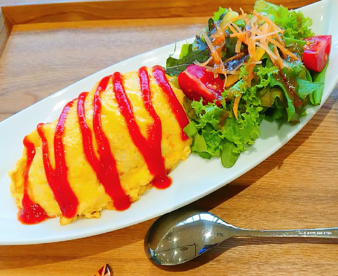 子供も大人も喜ぶオムライス。サラダは自家栽培で作った安心・安全なお野菜が10種類以上も入っています。オムライスよりもサラダがメインといえるくらいかも?!