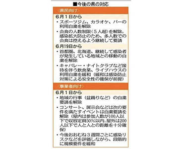 新型コロナウイルス特別措置法に基づく国の緊急事態宣言が全面解除されたことを受け、県は二十六日、県庁で対策本部会議を開き、県民に要請していたスポーツジムやカラオケ、バーの利用自粛を六月一日に解除すると決めた。県境を越えた移動も、首都圏の一都三県や北海道などとの往来を除いて解除する。(今井智文)