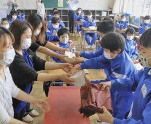 新型コロナウイルス予防策として、あわら市学校給食センターの職員たちが、配膳台のカバーやマスクケースを製作した。六月一日の学校再開、翌二日の給食開始に向けて市内の九小中学校に配布している。