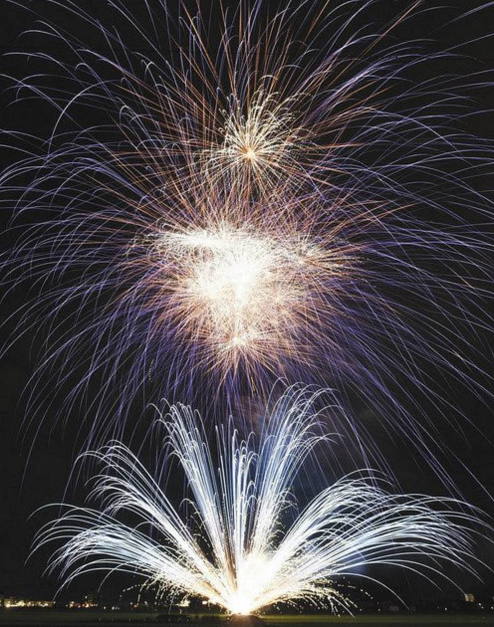 サプライズで打ち上げられ、県民に一時の安らぎを与えた花火=越前市高木町で新型コロナウイルスの収束を願い希望や元気を届けようと、同日同時刻に花火を打ち上げるプロジェクトで、全国の花火業者が一日、各地で一斉に花火を打ち上げた。県内では越前市高木町の上木銃砲火薬店が、市内二カ所で実施。コロナの影響で花火大会が中止になる中、光の大輪が夜空を彩り、上木康広社長(55)は「皆さんに喜んでもらえたのならうれしい」と話した。