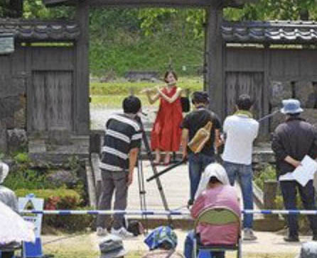 県が県内の名所を会場にミニコンサートを開く「ふくいミュージックリレー」が九日、始まった。初回は鯖江市出身のフルート奏者、杉原夏海さんが出演し、一乗谷朝倉氏遺跡の唐門(福井市城戸ノ内町)で美しい音色を響かせた。