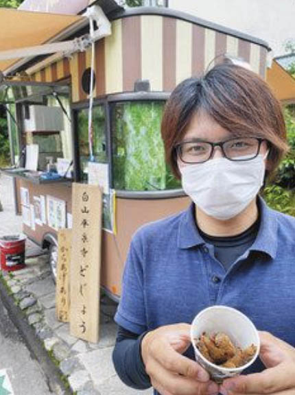 キッチンカー(奥)で出店し、ドジョウの唐揚げ(手前)を販売している谷代表=勝山市の平泉寺白山神社前で勝山市平泉寺町平泉寺の平泉寺白山神社前に、茶色を基調にしたおしゃれなキッチンカーが出店している。販売するのは地元企業が自社で養殖したドジョウの唐揚げ。ドジョウの栄養価はウナギに匹敵するとされるだけに、関係者らは夏バテ対策の新たなご当地グルメとしてPRし、養殖拡大で地域振興にもつながればと期待している。 (山内道朗)