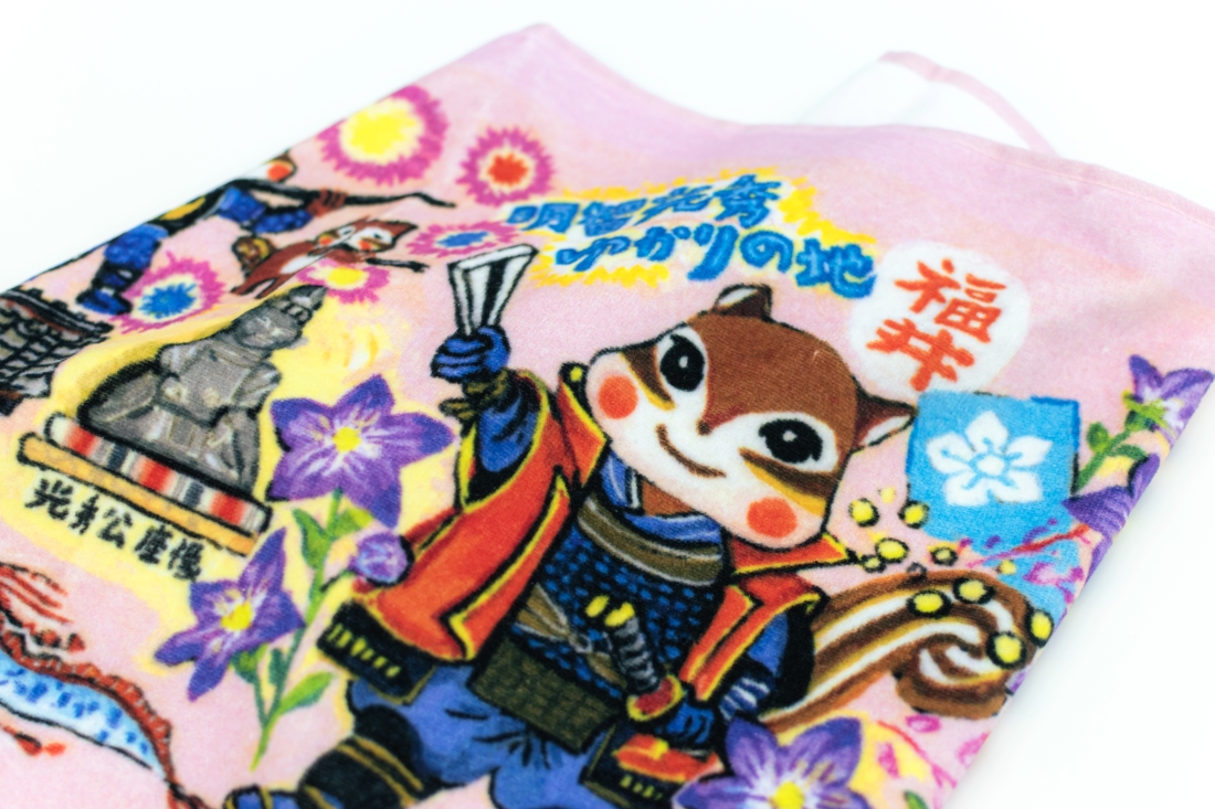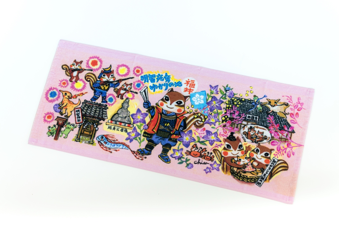 放送再開が待ちきれない、NHK大河ドラマ「麒麟がくる」。主人公・明智光秀の福井ゆかりの地を描いた、オリジナルタオルが完成しました! イラストを手がけたのはリスの絵柄で有名な作家・藤岡ちささん。「ちさの羽二重餅」(株式会社カリョー)のキュートなパッケージでおなじみですね。光秀や妻・煕子、娘・たま(細川ガラシャ)風のリスや明智家の家紋である桔梗の花も色鮮やかに描かれていますよ。