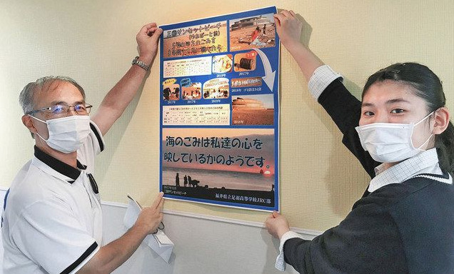増える海洋ごみへの理解を深めてもらおうと、足羽高校JRC(青少年赤十字)部は、坂井市の三国サンセットビーチで三年前から実施している海岸清掃の結果をまとめたポスターを作製した。「海のごみは私達の心を映しているかのようです」というキャッチフレーズも記し、同市の越前松島水族館などに掲示し、海洋ごみの深刻さを訴えている。(畑明日香)