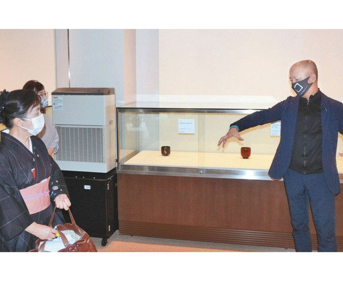 越前町の県陶芸館で二十六日、美術家で茶陶の大樋焼(おおひやき)の十一代大樋長左衛門さん=写真(右)=を招いたギャラリートークがあった。