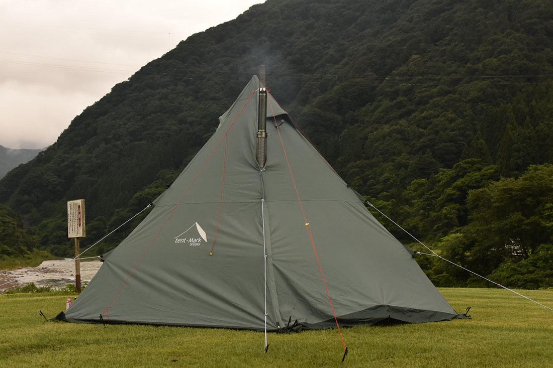 サウナで汗をかいた後は、水風呂代わりにテント横に流れる川の水でクールダウン。日本の名水百選にも選ばれる大野の天然水で汗を流す気分を贅沢に味わいたいところでしたが、この日はあいにく前日の悪天候により川の流れが激しかったので入れず、シャワーが水風呂の代わりでした。