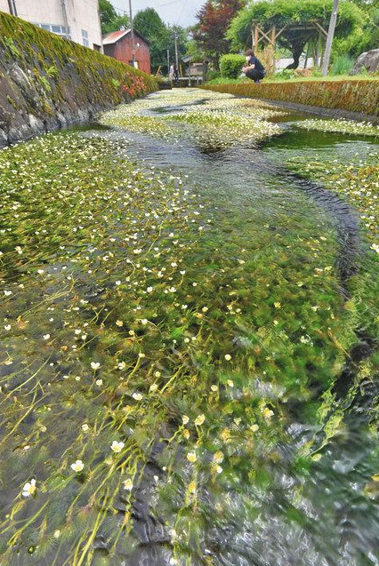 越前市上真柄町を流れる治左川(じさがわ)で、清流に育つキンポウゲ科の水生多年草バイカモが白い花を咲かせ、せせらぎに揺れて涼感を漂わせている。