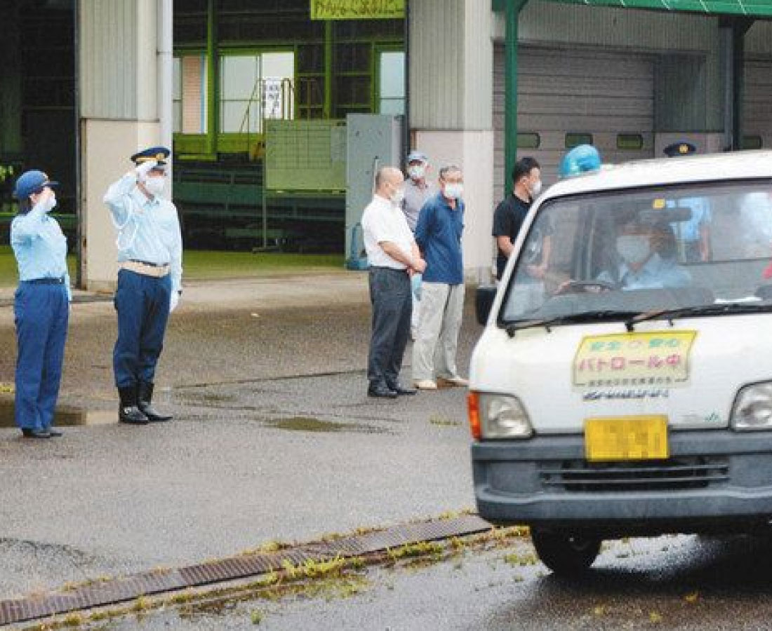 越前市白山(しらやま)地区の特産「しらやま西瓜(すいか)」の盗難被害を防ごうと、生産者や防犯隊、越前署などでつくる「こうのとり西瓜パトロール隊」の出発式が、越前市上杉本町の野菜集出荷施設であった。八月中旬まで巡回する。