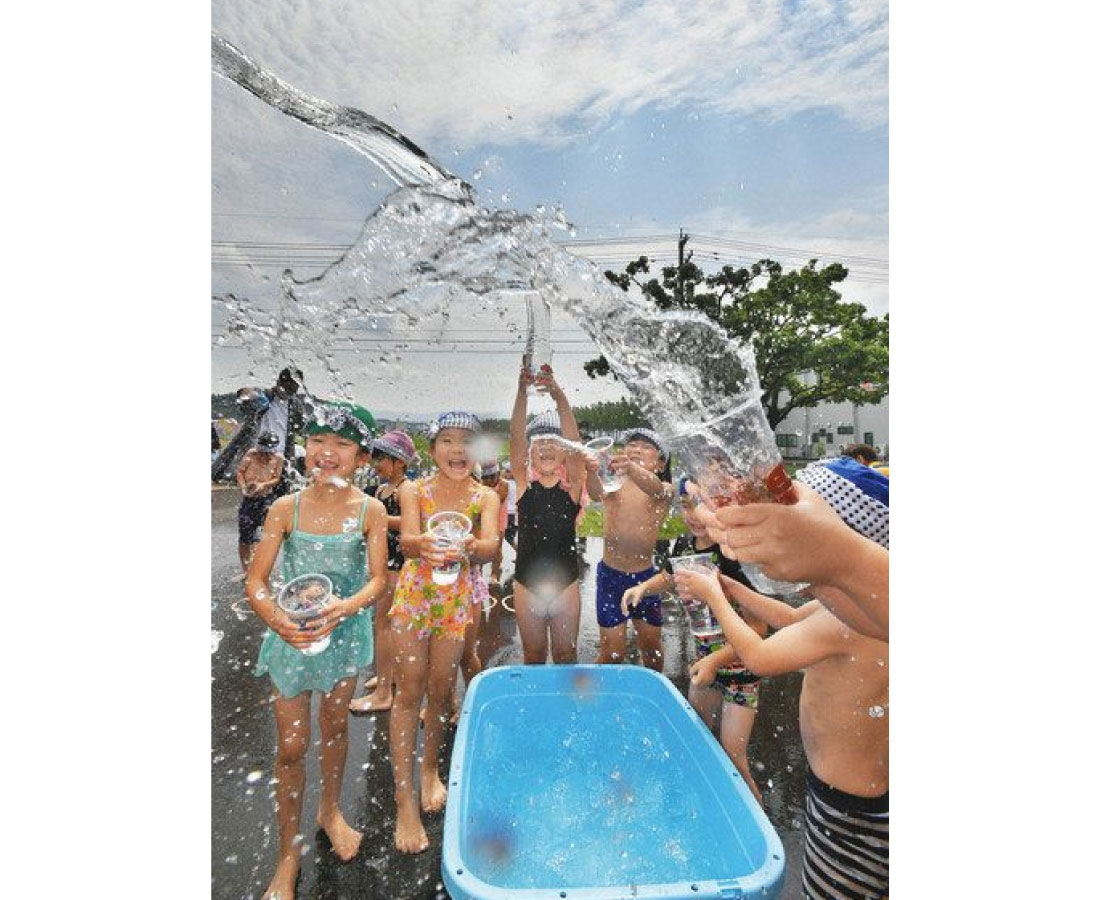 あわら市の宝「温泉」を使った湯かけ遊びが四日、市内のこども園で始まった。福井市で三五・〇度と今季県内初の猛暑日となる強い日差しの下、子どもたちは大はしゃぎで温泉を掛け合い、青空に笑い声を響かせた。五日までに全十二園で行う。